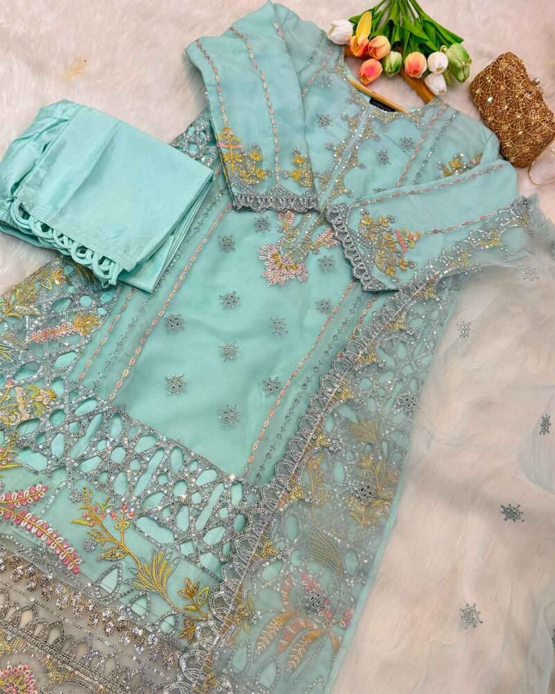 Work Type: Full-body sequin embroidery with Jari Suta work.