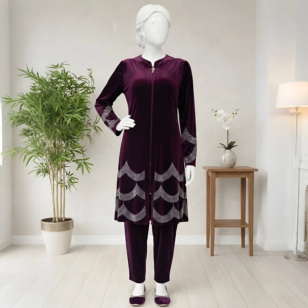 Elevate your winter wardrobe with this premium velvet co-ord suit, crafted to provide both warmth and refined elegance. The high-quality velvet fabric delivers a soft, luxurious feel while ensuring excellent protection during cold weather.
